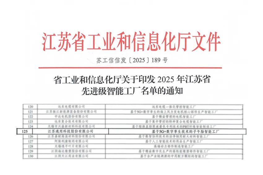 近日,江蘇省工業(yè)和信息化廳正式公布2025年江蘇省先進(jìn)級(jí)智能工廠名單,通用股份榮耀上榜。這一榮譽(yù)不僅是對通用股份前瞻創(chuàng)新實(shí)踐的高度認(rèn)可