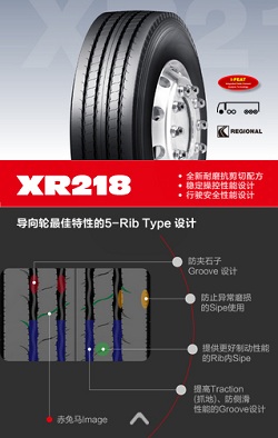 其中XR218采用全新耐磨抗剪切配方,更加穩(wěn)定的操控性能設(shè)計,以及保障行駛安全性能設(shè)計。其導(dǎo)向輪采用了5—Rib Type設(shè)計,包括防夾石子Groove設(shè)計;防止異常磨損的Sipe使用;提供更好制動性能的Rib內(nèi)Sipe;以及提高Traction(抓地)、防側(cè)滑性能的Groove設(shè)計。